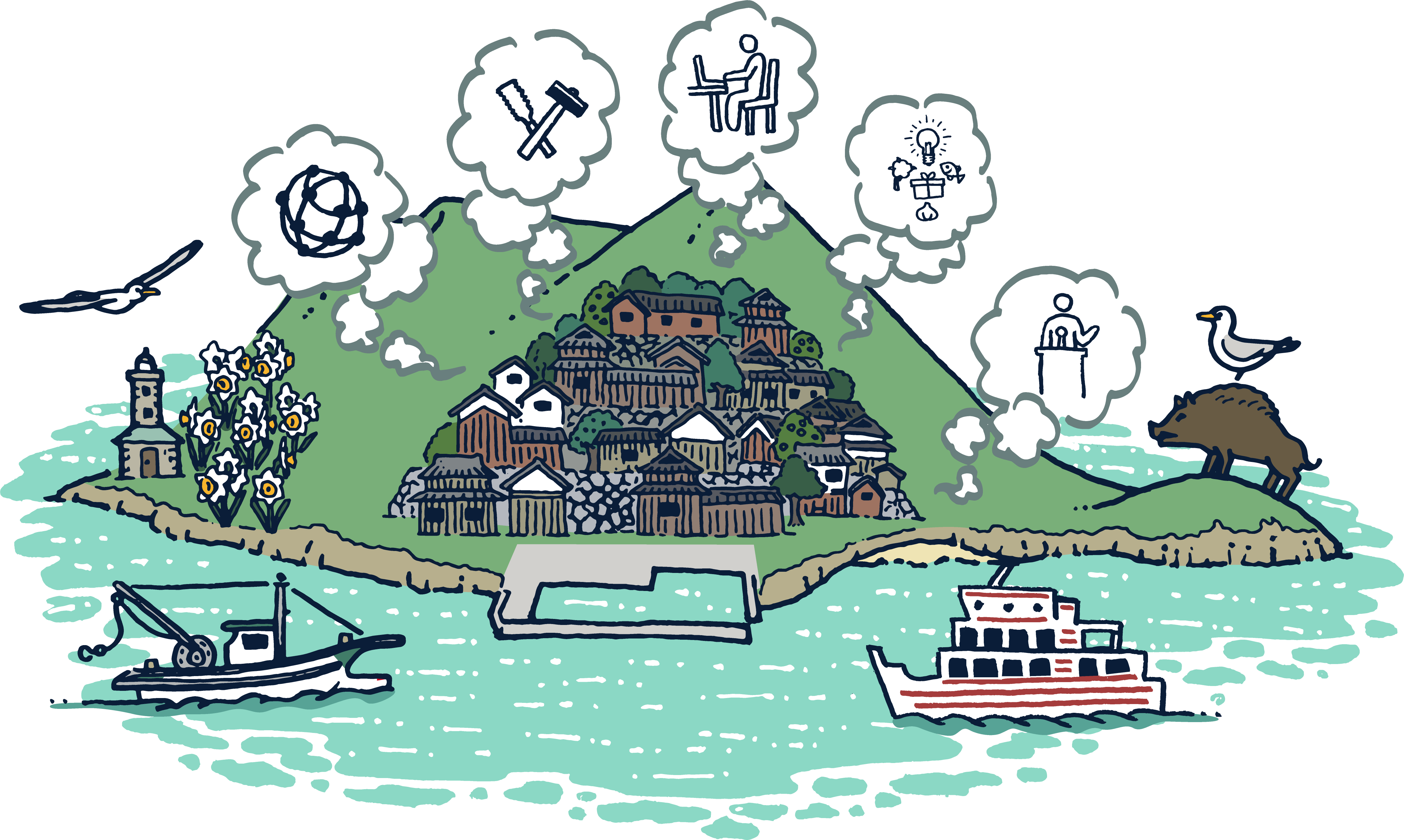 島民の仕事場として、集いの場として生活に溶け込む場所づくりを